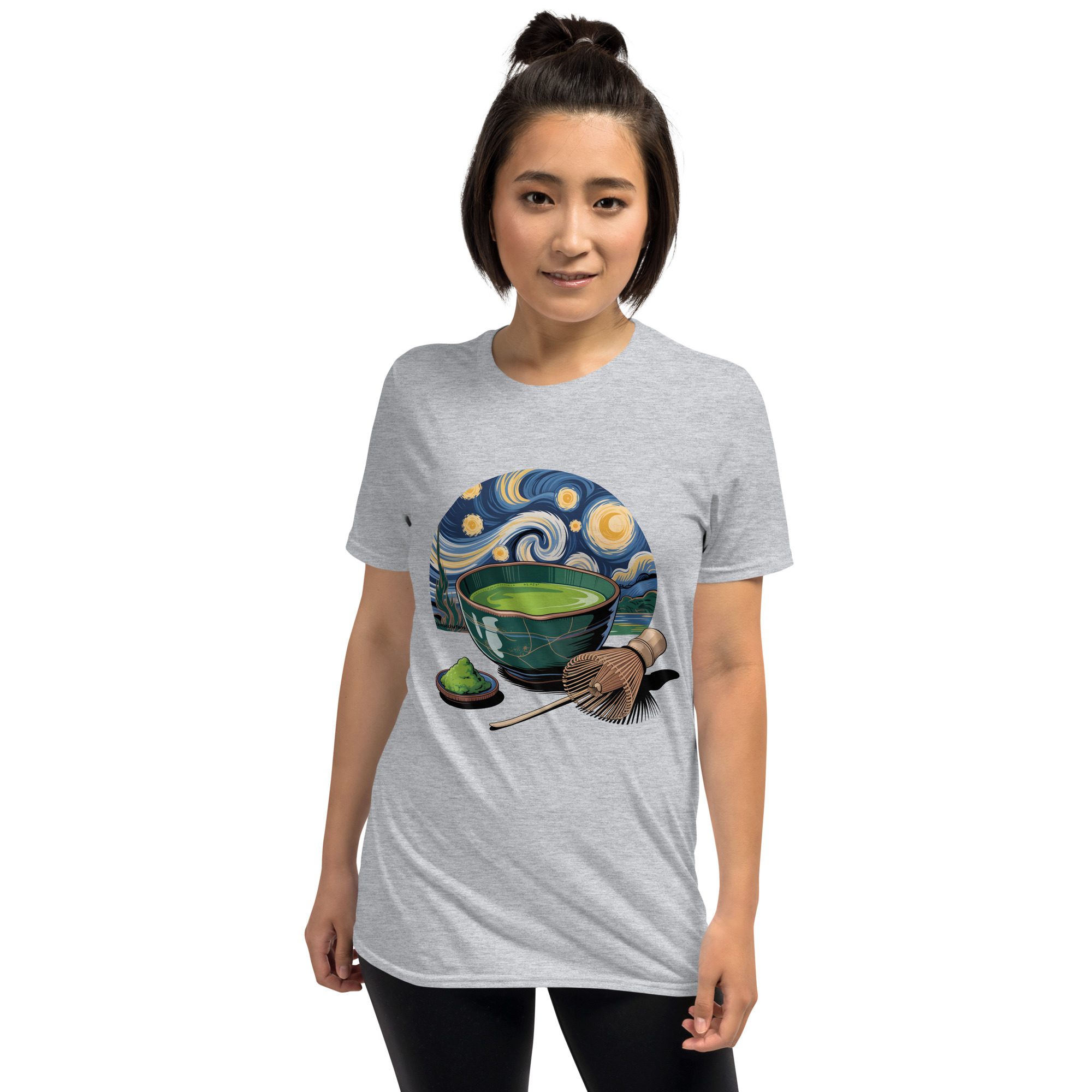 Si te gusta el té matcha o conoces a alguien al que le guste esta camiseta con un diseño original de un matcha tradicional con una ilustración de la noche estrellada de fondo es la tuya.